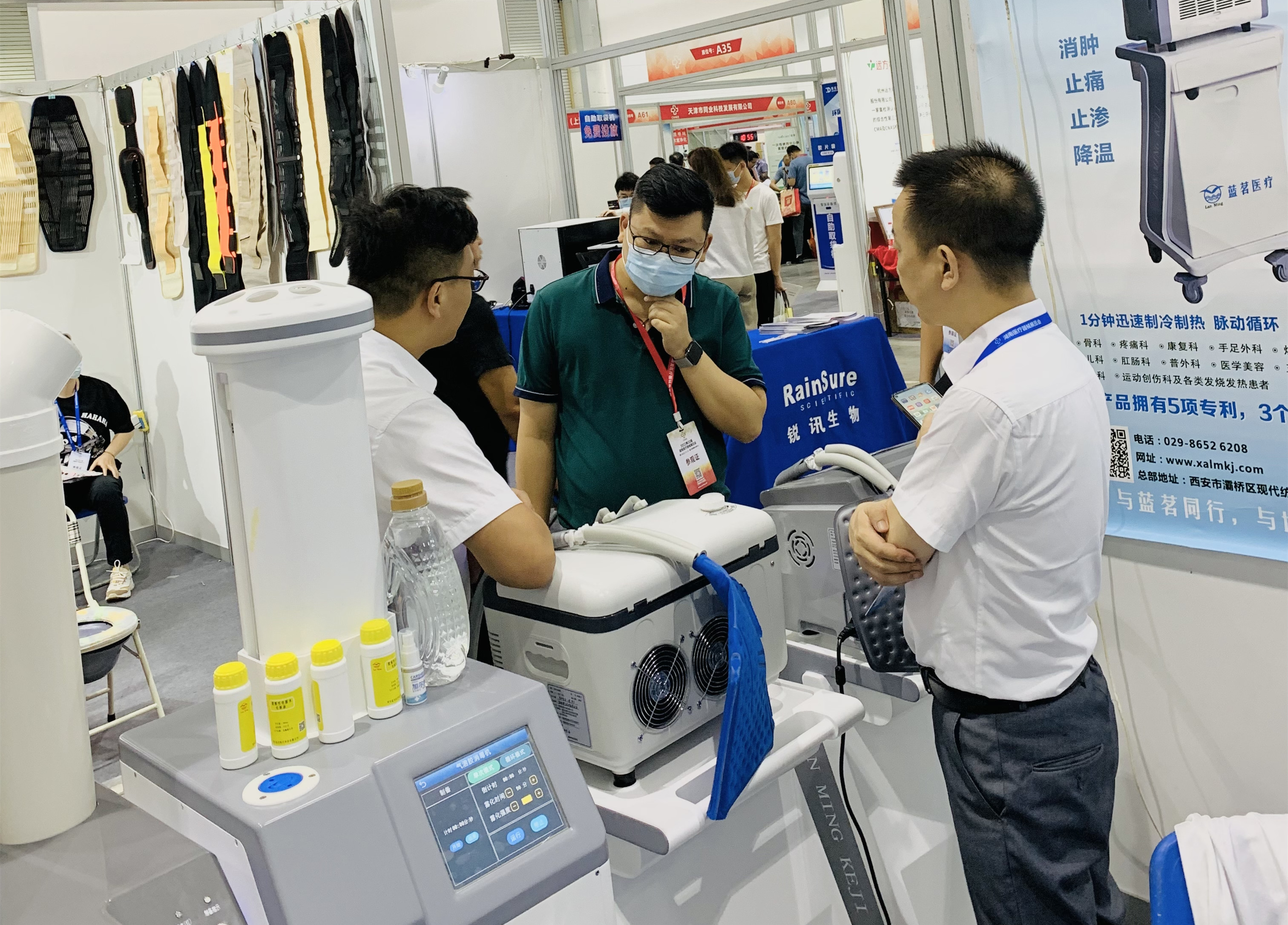 此外,全自動脈動加壓冷熱敷機(jī)、氣溶膠空氣消毒機(jī)等產(chǎn)品同樣為觀展嘉賓所青睞,其中氣溶膠空氣消毒機(jī)經(jīng)過現(xiàn)場使用展示,其良好的霧化消毒效果、打破消毒局限的設(shè)計、適用環(huán)境廣泛、人機(jī)共存等特點獲得諸多參展嘉賓認(rèn)可,更有嘉賓表示“這是‘實實在在’的高效消毒過程,讓人安心不少”。另外體驗過全自動脈動加壓冷熱敷機(jī)后,幾位觀展嘉賓同樣給出了高度的評價。